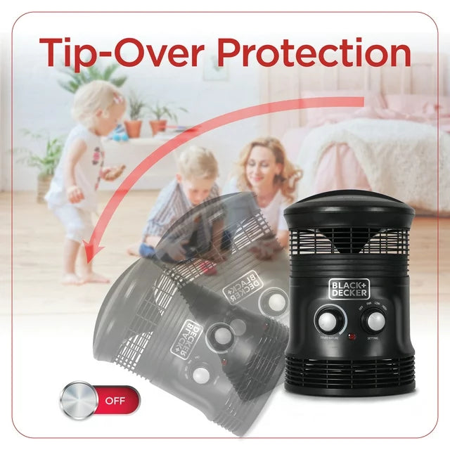This BLACK+DECKER small electric heater is a phenomenal addition to your home or office with its superior heating capabilities. This space heater with thermostat has manual controls and a bright indicator light that makes navigating the unit seamless. The small room heater weighs just 4.32 lbs. so you can take with you anywhere you like thanks to its carrying handle. The 360° surround heater warms a room evenly and efficiently, which is important in the cold weather months. Use this space heater fan anywhere you please, whether as a bedroom heater or office heater! This surround space heater also comes with 3 settings: Fan Only, Low Heat (750 Watts), and High Heat (1,500 Watts). And when it comes to safety, this mini heater for office desk includes overheat protection and a tip-over auto shutoff function. Whether you use the BLACK+DECKER BHDS156 as a heater for bedroom or a space heater for office, its surround air capabilities will impress safely, thoroughly, and efficiently.